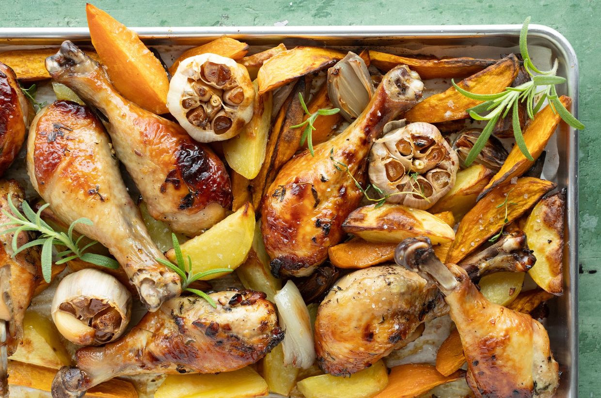 Homey and satisfying, whole roast chicken loaded with root vegetables.